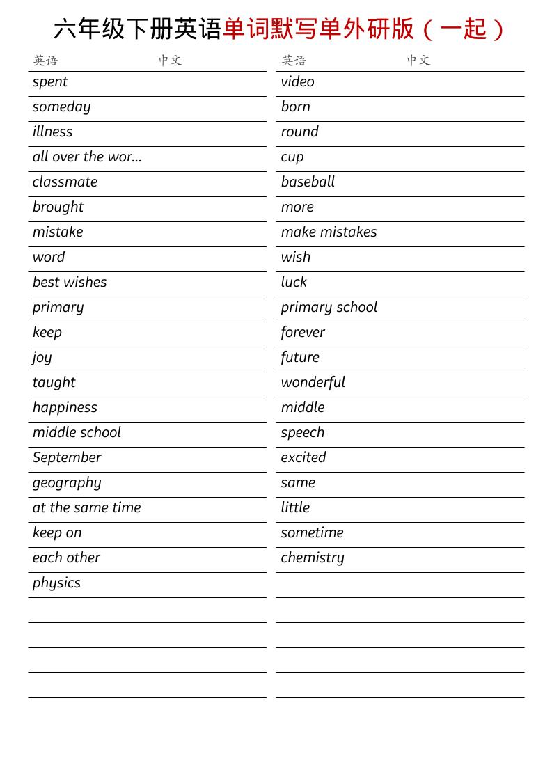 六年级下英语全册单词默写单《外研版(一起)》admin9天前更新关注私信011457六年级下英语全册单词默写单《外研版(一起)》此内容为付费资源,请付费后查看s9.9月度会员免费永久会员免费立即购买您当前未登录!建议登陆后购买,可保存购买订单付费资源已售 51 ——预览已结束,还剩2页未读——您已获得此文档下载权限,请点击底部下载完整文档 © 版权声明文章版权归作者所有,未经允许请勿转载。THE END学科资料 喜欢就支持一下吧点赞57 分享QQ空间微博QQ好友海报分享复制链接收藏
